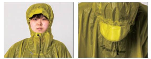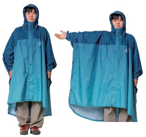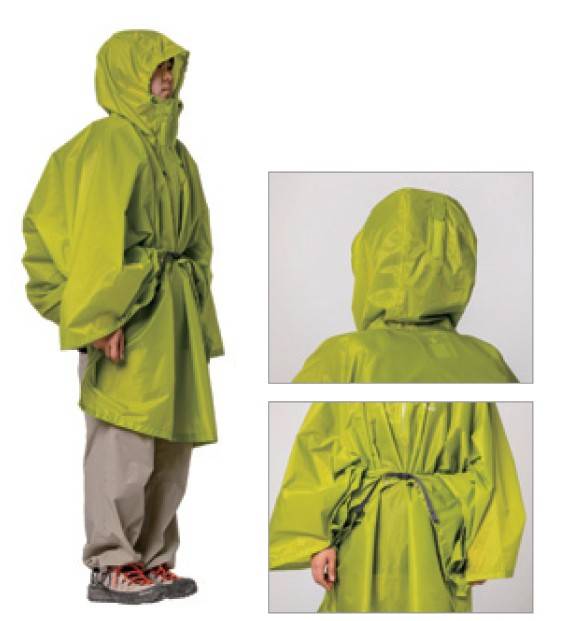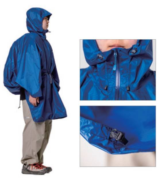 배낭을 멜 수 있도록 설계된 판초우의다. 배낭을 메고 판초우의를 뒤집어 쓴 후 버클로 뜬 공간을 고정시킬 수 있다. 약 30L의 배낭까지 메고 착용 가능하다. 우의 앞쪽 지퍼를 통해 입고 벗기 편하도록 만들었다. 방수 기능이 있는 아쿠아 텍트 지퍼를 사용했다.
