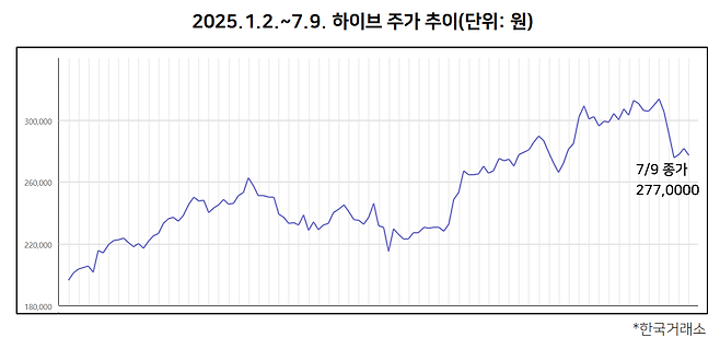 10일 한국거래소에 따르면 하이브 주가는 이달 연초 대비 60% 가까이 상승한 31만원대까지 올라섰다. 하이브 소속 아이돌그룹 BTS 멤버가 완전체 복귀 신호탄을 알린 6월 한 달 동안만 주가가 16% 상승했다. 여기에 이재명 정부 출범 이후 한국과 중국의 관계 회복 가능성을 바탕으로 한한령(한류 제한령) 해제 기대감이 맞물려 엔터테인먼트 플랫폼 기업의 투자 가치가 부각된 점 역시 하이브에 호재였다.
