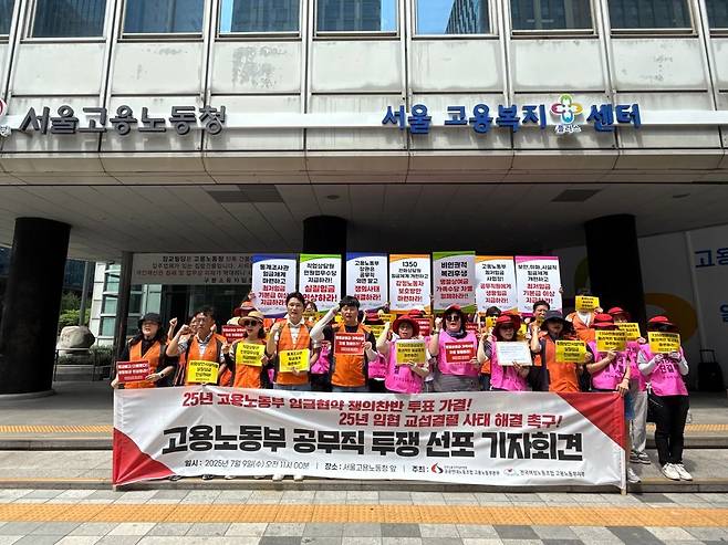 민주노총 공공연대노동조합과 전국여성노동조합은 9일 오전11시 서울지방고용노동청 앞에서 '25년 고용노동부 임·단협 쟁의찬반 투표 가결! 25년 임·단협 교섭결렬 사태 해결 촉구! 고용노동부 공무직 투쟁 및 파업 선포 기자회견'을 개최했다.