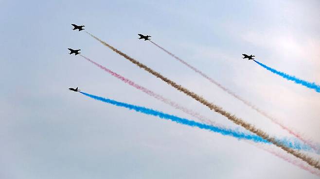 제1회 방위산업의 날(7월 8일) 계기 시민 참여 페스티벌에 참가하는 공군 특수비행팀 블랙이글스가 에어쇼를 위한 비행연습을 10∼12일 반포대교∼동작대교 일대에서 실시한다고 방위사업청이 밝혔습니다.