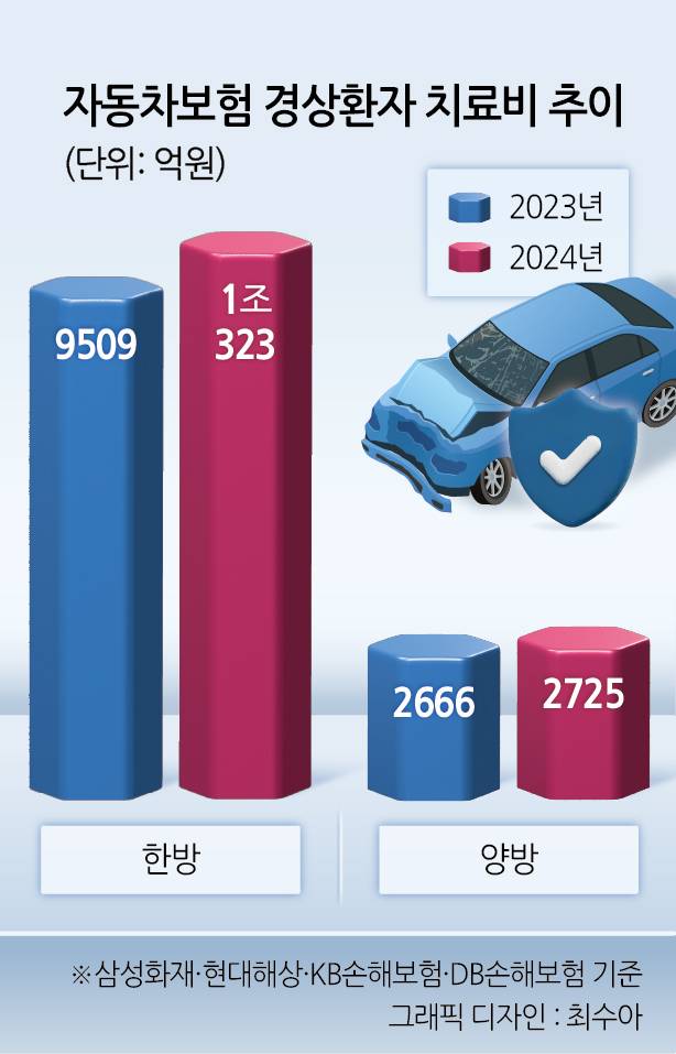 자동차보험에서 경상환자의 과잉진료·장기치료가 급증하면서, 보험금 누수와 손해율 상승 문제가 지속됐다. 지난해 한방 경상환자 치료비는 연간 약 1조323억원을 기록해, 양방 치료비(2725억원)의 약 3.8배에 달했다. 전년 대비 증가율도 한방(8.6%)은 양방(2.2%)의 4배였다. 전체 한방진료비도 매년 급증해 총진료비 대비 비중이 지난 2015년 23%에서 59.2%까지 올라섰다. 전체 자동차보험 진료비 10건 중 6건이 한방 치료로 쏠리면서, 과도한 한방 쏠림이 나타나고 있다.