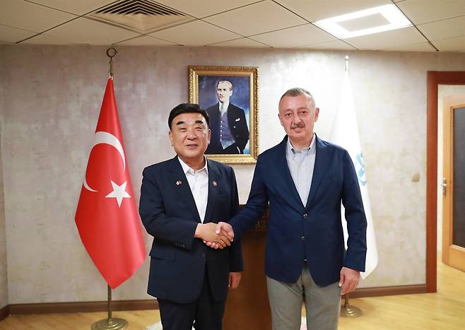 | ▲ 울산시 경제사절단을 이끌고 해외 순방중인 김두겸 울산시장이 현지시간 9일 자매도시인 튀르키예 코자엘시를 방문해 타히르 부육아큰 시장과 기념촬영을 하고 있다 |