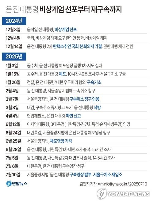 (서울=연합뉴스) 김민지 기자 = 위헌·위법적 비상계엄 선포로 한차례 구속됐다 풀려난 윤석열 전 대통령이 10일 두 번째 구속영장 발부로 석방 124일 만에 재구속됐다.