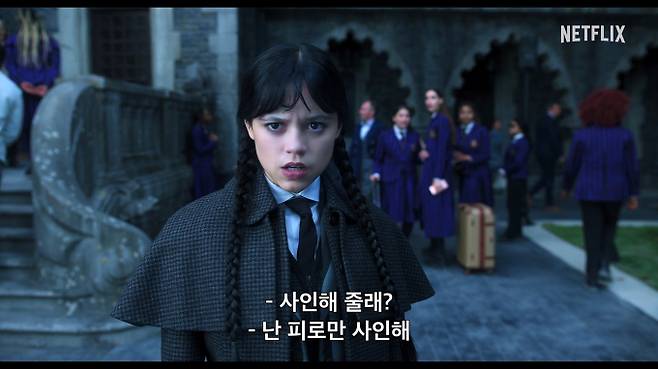 메인 예고편은 ‘네버모어 아카데미’로 돌아온 ‘웬즈데이’(제나 오르테가)와, 학교로 돌아온 기분을 묻는 ‘모티시아’(캐서린 제타 존스)의 모습으로 시작한다. 새로 부임한 교장인 ‘베리 도트’(스티브 부세미)의 지나친 관심, 그리고 지난해 이후 생겨난 팬들은 ‘웬즈데이’에게 성가시고 귀찮기만 하다. 사인을 해달라는 요청에 “난 피로만 사인해”라며 섬뜩한 답을 하거나, 기숙사 방문 앞에 붙어 있는 수많은 팬레터와 팬아트를 가차 없이 떼어 버리는 모습은 변함없이 단호한 ‘웬즈데이’의 성격을 그대로 보여준다.