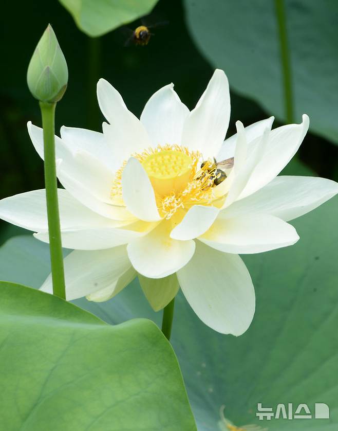 [울산=뉴시스] 배병수 기자 = 폭염이 연일 기승을 부리는 10일 오전 울산 남구 선암호수공원 내 연못에 연꽃이 활짝 펴 있다. 2025.07.10.bbs@newsis.com.