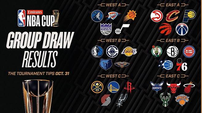 NBA는 10일(한국시간) 공식 홈페이지를 통해 2025-2026시즌 초반 진행될 NBA컵 조 편성 결과를 발표했다. 조 편성은 지난 시즌 성적을 기준으로 시드를 배정한 이후 추첨을 통해 이뤄졌다.