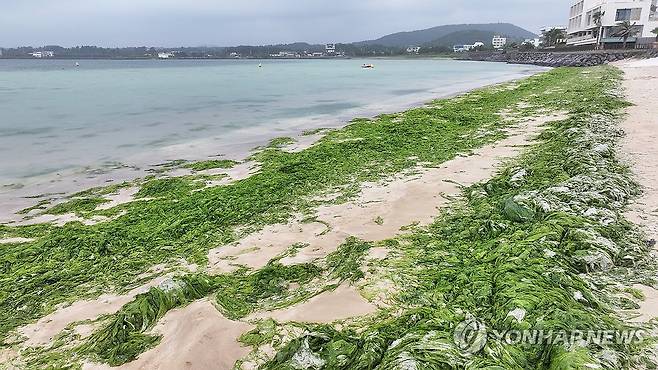 (서귀포=연합뉴스) 박지호 기자 = 10일 오전 제주 서귀포시 성산읍 고성리 신양섭지해수욕장 백사장에 대량의 구멍갈파래가 밀려 들어와 있다.