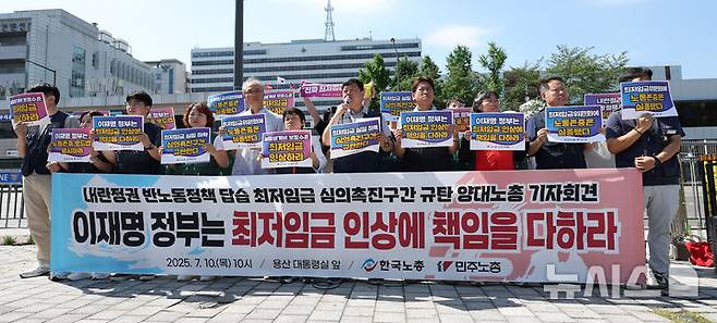 [서울=뉴시스] 김선웅 기자 = 류기섭 한국노총 사무총장이 10일 서울 용산구 대통령집무실 앞에서 열린 한국노총-민주노총이 공동 개최한 최저임금 심의촉진구간 규탄 기자회견에서 최저임금 실질 하락 심의촉진구간을 규탄하며 실질생계비 보장수준의 최저임금 인상을 촉구하고 있다. 2025.07.10. mangusta@newsis.com