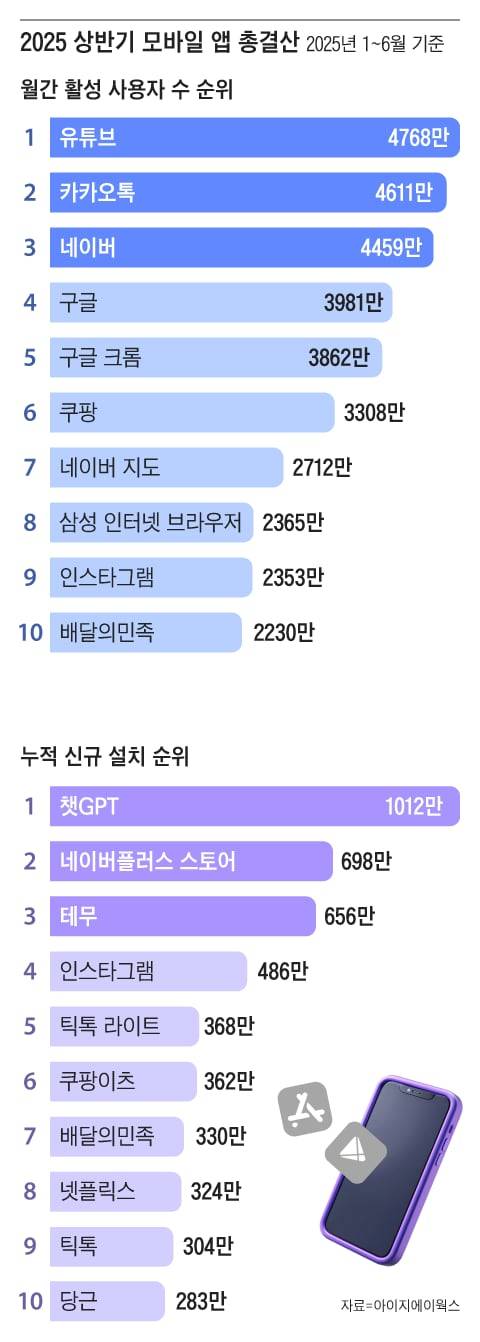 올해 상반기 국내에서 가장 많이 사용한 앱은 유튜브였고, 가장 많이 설치한 앱은 생성형 AI 챗GPT였다.