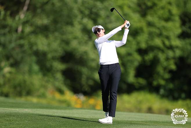 [서울=뉴시스] 10일 강원도 정선에 위치한 하이원CC에서 열린 '하이원리조트 여자오픈 2025' 1R 18번홀에서 전우리가 세컨드샷을 하고 있다. (사진=KPLGA 제공) 2025.07.10. photo@newsis.com *재판매 및 DB 금지