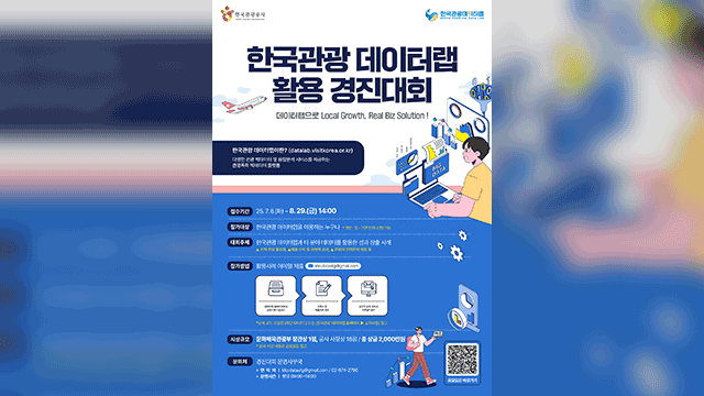 한국관광공사가 다음 달 29일까지 ‘한국관광 데이터랩 활용 경진대회’ 참가 신청을 받는다고 오늘(10일) 밝혔습니다.