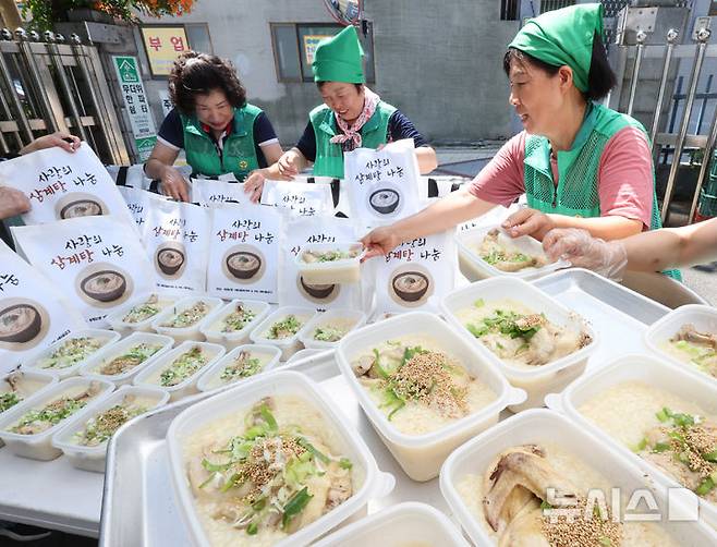 [인천=뉴시스] 전진환 기자 = 연일 폭염이 이어지는 10일 오전 인천 동구 송림2동 행정복지센터에서 새마을부녀회 회원들이 관내 홀몸어르신, 한부모가정 등 취약계층에서 전달할 삼계탕을 만들고 있다. 2025.07.10. amin2@newsis.com