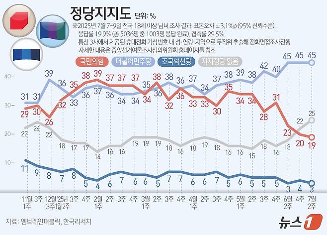 (서울=뉴스1) 김지영 디자이너 = 엠브레인퍼블릭·케이스탯리서치·코리아리서치·한국리서치가 지난 7일부터 9일까지 사흘간 전국 만 18세 이상 남녀 1003명을 대상으로 한 전국지표조사(NBS)에 따르면, 정당지지도를 살펴보면 더불어민주당은 45%, 국민의힘이 19%로 집계됐으며, 조국혁신당은 3%로 나타났다.