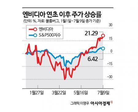 올해 주가 오름세는 더 가팔랐다. 엔비디아는 인공지능(AI) 붐에 이은 기술주 랠리를 주도하면서 대장주로 거듭났다. 올해 들어 엔비디아 주가는 21%가량 뛰어 시장수익률을 14%포인트 넘게 웃돌았다. 기간을 늘려 2023년 초 이후로 잡아보면 주가는 10배 이상 폭등했다. 블룸버그통신에 따르면 시장에서 차지하는 비중도 커졌다. 엔비디아는 S&P500지수의 7.5%를 차지하며 이는 역대 최고 수준이다.
