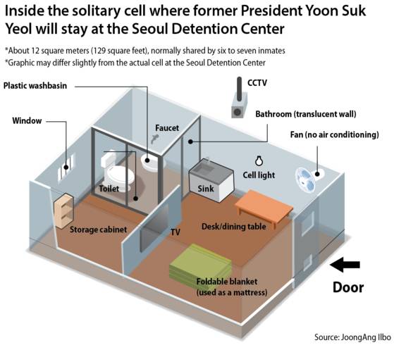 Correctional authorities expect Yoon will stay alone in a cell typically designated for three or more inmates, citing the precedent set by former President Park Geun-hye’s confinement.