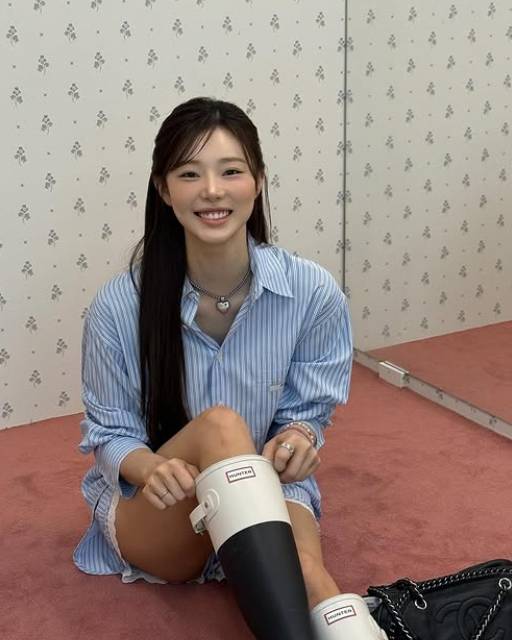 여기에 레인부츠의 시크한 무드와 짧은 쇼츠가 어우러져 그의 다리 라인을 강조하며 세련된 '꾸안꾸' 룩을 완성했다.