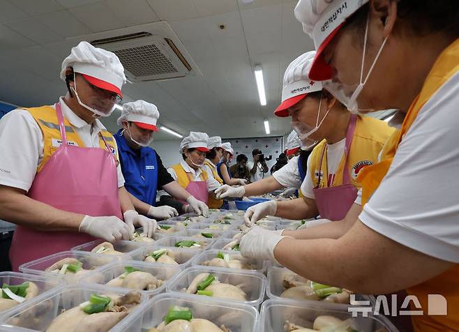 [서울=뉴시스] 배훈식 기자 = 고려아연 임직원과 적십자 봉사자들이 10일 오전 서울 노원구 대한적십자사 서울북부봉사관에서 20205년 건강한 여름나기 보양식 나눔 행사를 위한 삼계탕을 포장하고 있다. 2025.07.10. dahora83@newsis.com