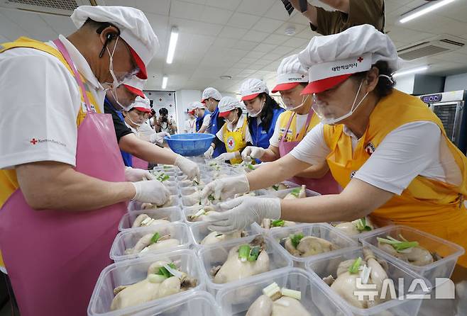 [서울=뉴시스] 배훈식 기자 = 고려아연 임직원과 적십자 봉사자들이 10일 오전 서울 노원구 대한적십자사 서울북부봉사관에서 20205년 건강한 여름나기 보양식 나눔 행사를 위한 삼계탕을 포장하고 있다. 2025.07.10. dahora83@newsis.com