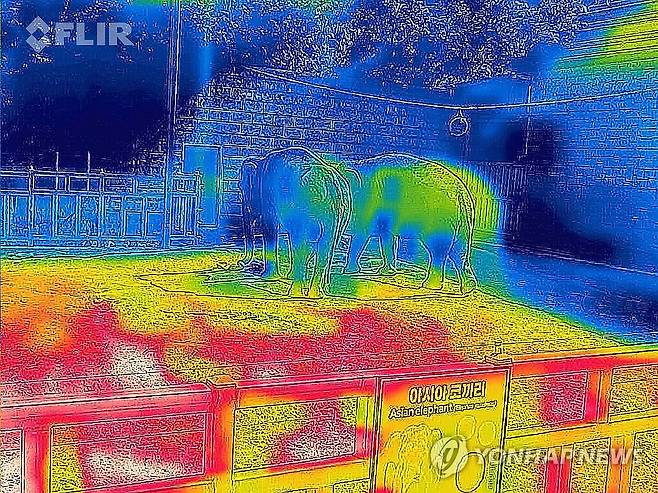 (광주=연합뉴스) 정다움 기자 = 연일 폭염특보가 이어지고 있는 10일 오전 광주 북구 우치공원 동물원에 있는 코끼리를 열화상 카메라로 촬영한 모습. 온도가 낮은 곳은 푸르게, 높은 곳은 붉게 표시돼 있다. 2025.7.10