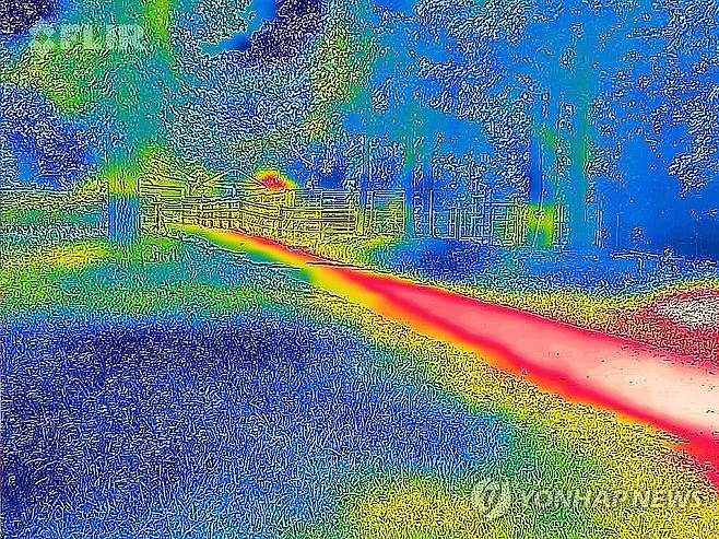 (광주=연합뉴스) 정다움 기자 = 연일 폭염특보가 이어지고 있는 10일 오전 광주 북구 우치공원 동물원에 있는 산책로를 열화상 카메라로 촬영한 모습. 온도가 낮은 곳은 푸르게, 높은 곳은 붉게 표시돼 있다. 2025.7.10