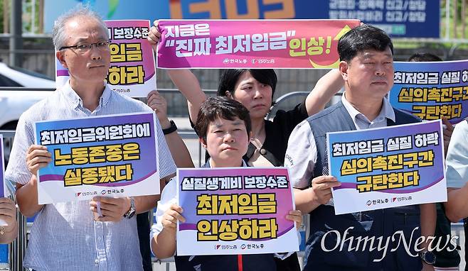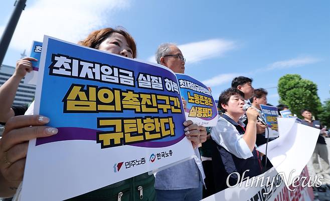 양대노총은 "지난 3년 간 물가는 급등했지만, 물가상승률에도 못 미치는 최저임금 인상률로 실질임금이 하락해 노동자 서민들은 생존권을 위협받고 있다"며 "그럼에도 윤석열 정권이 임명한 최저임금 공익위원들은 1.8%~4.1%의 낮은 심의촉진구간을 제시해 노동자의 실질임금을 심각하게 침해하고 있다"고 강조했다.