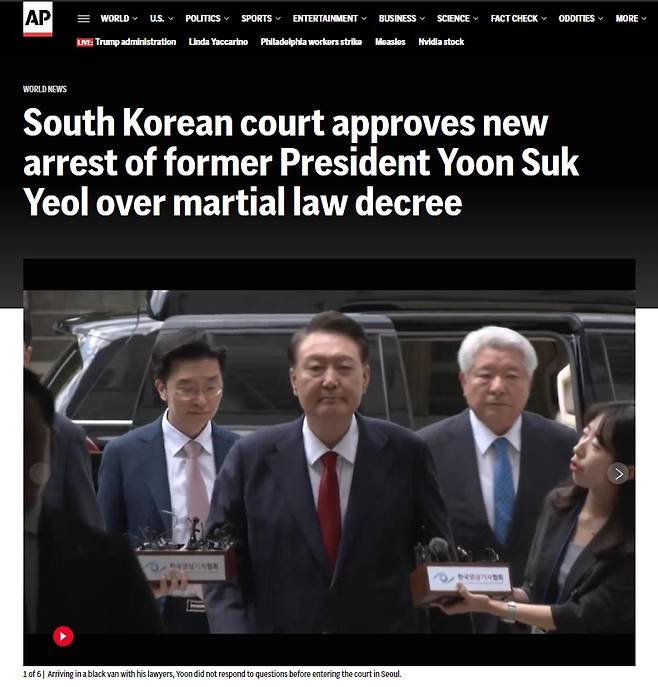 AP통신은 9일(현지시각) "한국 법원이 윤 전 대통령의 새로운 구속 영장을 발부했다"라며 "윤 전 대통령의 비상계엄 선포 관련 혐의에 대해 증거 인멸의 우려가 있다는 특검의 주장을 받아들였다"라고 전했다.