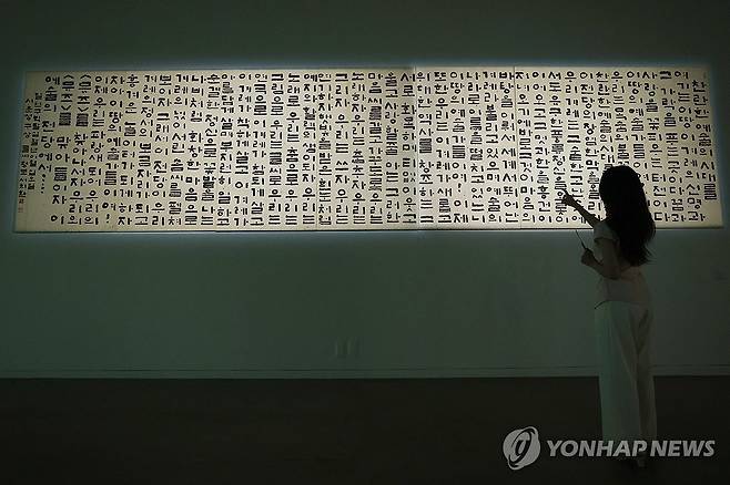 (서울=연합뉴스) 강민지 기자 = 10일 서울 서초구 예술의전당 서울서예박물관에서 열린 '평보 서희환: 보통의 걸음' 전시 프리뷰에서 관계자가 '찬란한 예술의 시대를 - 구상 시'를 살펴보고 있다. 2025.7.10