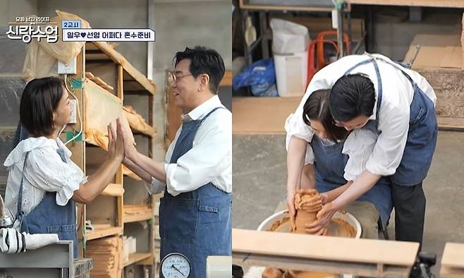 이어 두 사람은 서로를 위한 그릇 만들기에 도전했다. 앞치마를 함께 묶어주는 모습에서부터 설렘이 감돌았고 이를 지켜보던 패널들은 "혹시 영화 '사랑과 영혼"처럼 백허그 장면이 나오는 것 아니냐?"라며 기대를 감추지 못했다.