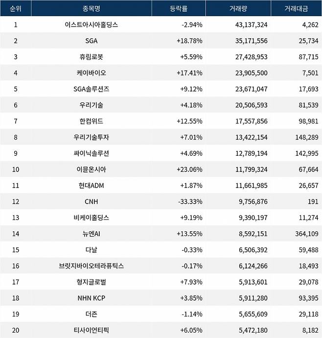 한편, 거래량 상위 20위권 종목들은 현대ADM(187660) ▲1.87%, CNH(023460) ▼33.33%, 비케이홀딩스(050090) ▲9.19%, 뉴엔AI(463020) ▲13.55%, 다날(064260) ▼0.33%, 브릿지바이오테라퓨틱스(288330) ▼0.17%, 형지글로벌(308100) ▲7.93%, NHN KCP(060250) ▲3.85%, 더즌(462860) ▼1.14%, 티사이언티픽(057680) ▲6.05% 등의 성적을 기록했다.