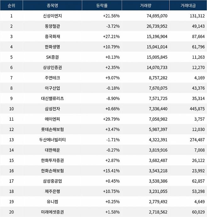 한편 거래량 상위 20위권 종목들은 에이엔피(015260) ▲29.79%, 롯데손해보험(000400) ▲3.47%, 두산에너빌리티(034020) ▼1.71%, 대한해운(005880) ▼0.27%, 한화투자증권(003530) ▲2.87%, 한화손해보험(000370) ▲15.41%, 삼성중공업(010140) ▲0.45%, 제주은행(006220) ▲10.75%, 유니켐(011330) ▲0.25%, 미래에셋증권(006800) ▲1.58% 등의 성적을 기록했다.