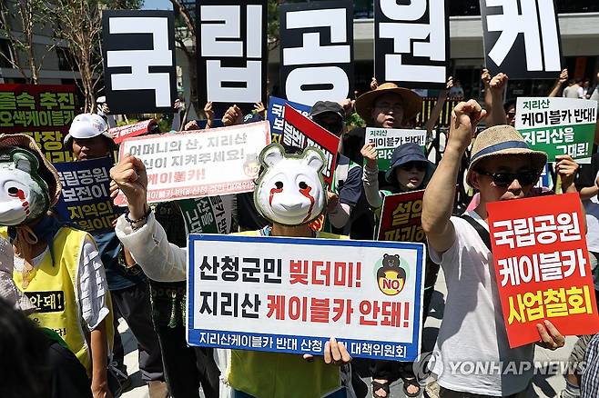 (서울=연합뉴스) 윤동진 기자 = 10일 서울 국정기획위원회 앞에서 열린 '국립공원 케이블카 전면 백지화' 요구 기자회견에서 참석자들이 관련 구호를 외치고 있다. 2025.7.10