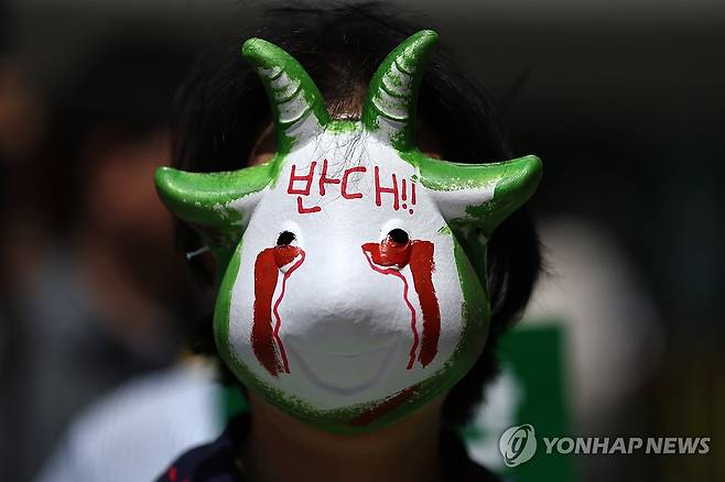 (서울=연합뉴스) 윤동진 기자 = 10일 서울 국정기획위원회 앞에서 열린 '국립공원 케이블카 전면 백지화' 요구 기자회견에서 참석자가 동물 탈을 쓴 채 케이블카 백지화를 촉구하고 있다. 2025.7.10