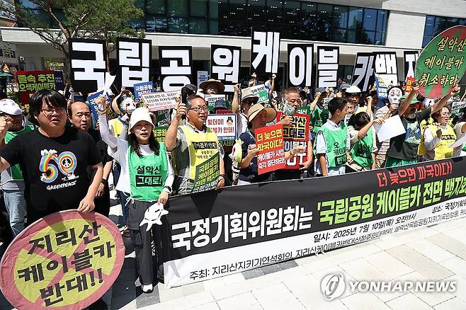 (서울=연합뉴스) 윤동진 기자 = 10일 서울 국정기획위원회 앞에서 열린 '국립공원 케이블카 전면 백지화' 요구 기자회견에서 설악산국립공원지키기국민행동 등 참석자들이 관련 구호를 외치고 있다. 2025.7.10