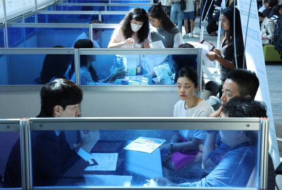 ['2024 부산 외국인 유학생 취업박람회'가 열린 27일 오후 부산 남구 경성대 건학기념관을 찾은 외국인 유학생들이 구인 업체 부스에서 채용 상담을 하고 있다. (부산=연합뉴스)]