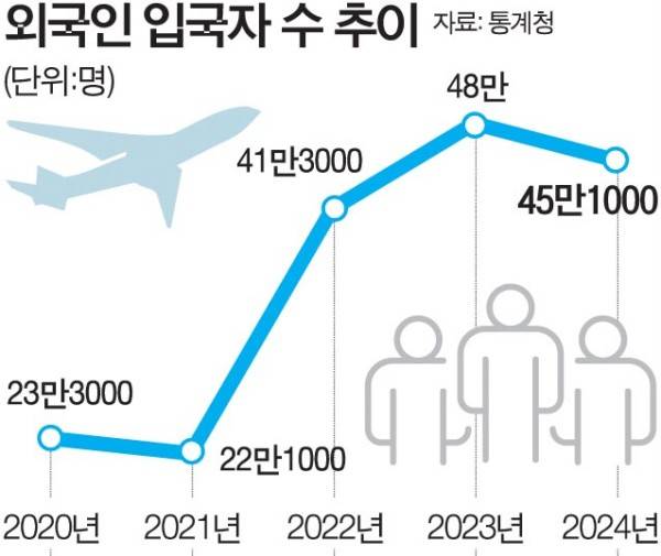 통계청이 10일 발표한 ‘2024년 국제 인구이동 통계’ 자료를 보면 지난해 외국인 입국자 수는 45만1000명으로 전년(48만 명)보다 2만9000명(6.0%) 줄었다.