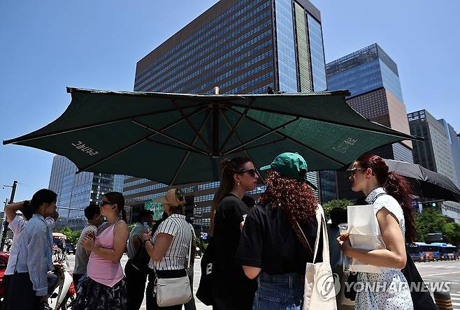 (서울=연합뉴스) 윤동진 기자 = 무더위가 이어지는 10일 서울 세종로 사거리에서 시민들이 햇빛 가림막 아래에서 신호를 기다리고 있다. 2025.7.10