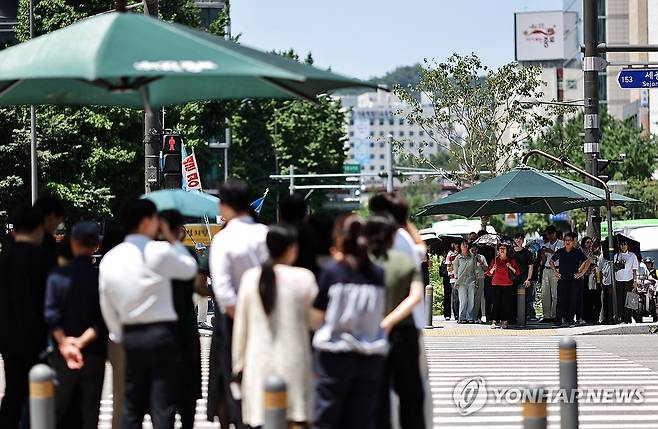 (서울=연합뉴스) 윤동진 기자 = 무더위가 이어지는 10일 서울 세종로 사거리에서 시민들이 햇빛 가림막 아래에서 신호를 기다리고 있다. 2025.7.10