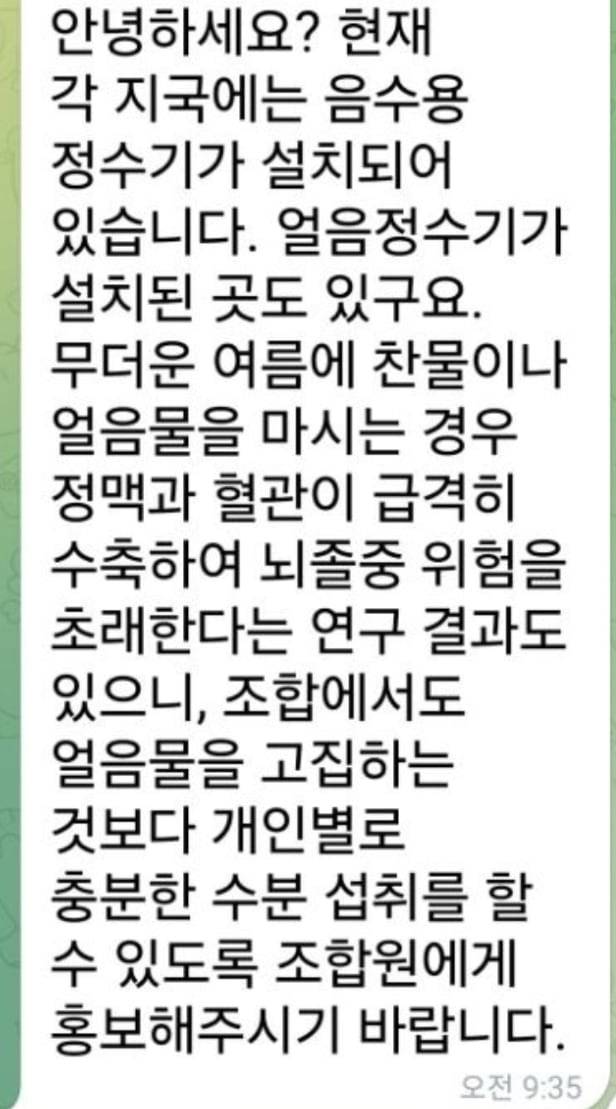 "특수고용직인 코웨이 방문점검 노동자가 노동부 폭염 가이드에 따라 시원한 얼음물을 지급해 줄 것을 회사에 요청했습니다. 하지만 회사 관계자는 '너무 더울 때 얼음물 마시면 뇌졸중 위험이 높아진다는 연구도 있다'는 황당한 답변으로 거부했습니다."