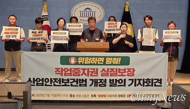 | ▲ 민주노총과 정혜경 진보당 국회의원이 10일 오전 11시 국회 소통관에서 '위험하면 멈춰! 작업중지권 실질보장 산업안전보건법 개정 발의' 기자회견을 열었다. |