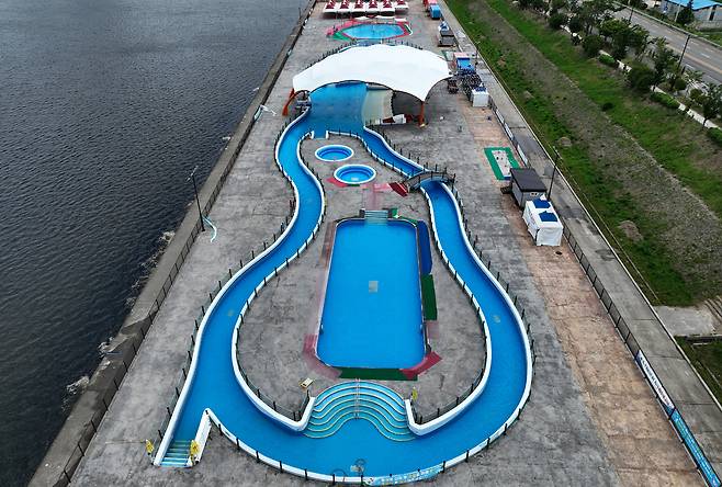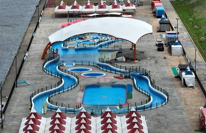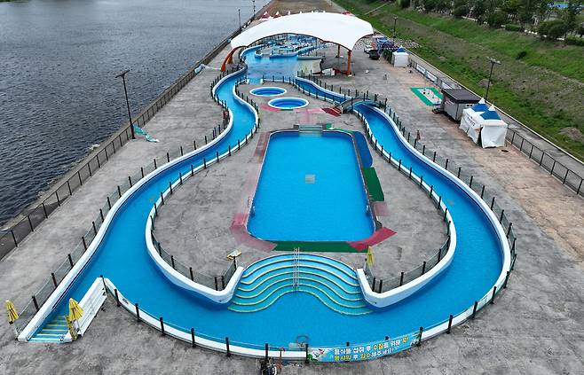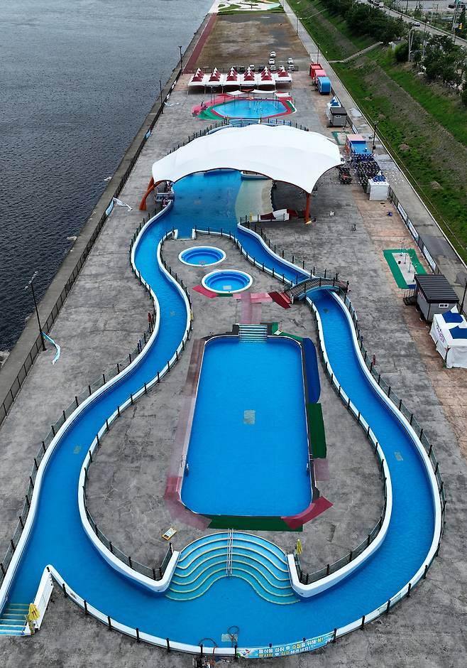 포항시 남구 연일읍 형산강 야외 물놀이장이 오는 12일 개장해 다음 달 27일까지 운영한다. 1회차 10~13시, 2회차 14~17시 하루 2회 운영되며, 한 회차당 정원은 700명으로 포항시 시설관리공단 홈페이지 사전예약자만 이용할 수 있다. 사진은 10일 오후 개장 준비를 마친 물놀이장 전경. /이용선기자 photokid@kbmaeil.com