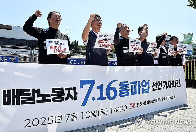 (서울=연합뉴스) 윤동진 기자 = 10일 오후 서울 전쟁기념관 앞에서 열린 배달노동자 7.16 총파업 선언 기자회견에서 민주노총 배달플랫폼 노조원들이 관련 구호를 외치고 있다. 2025.7.10