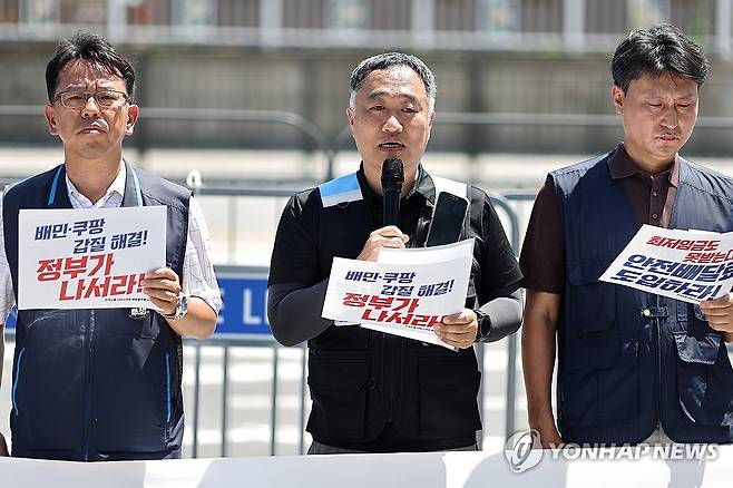 (서울=연합뉴스) 윤동진 기자 = 10일 오후 서울 전쟁기념관 앞에서 열린 배달노동자 7.16 총파업 선언 기자회견에서 홍창의 배달플랫폼 노조 위원장이 발언하고 있다. 2025.7.10