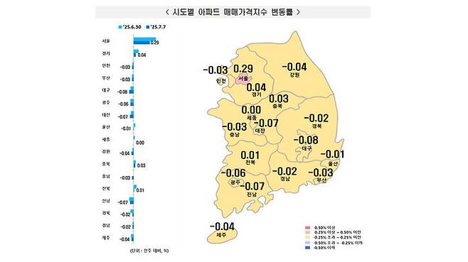 한국부동산원이 오늘(10일) 발표한 7월 첫째 주(7월 7일 기준) 전국 주간 아파트 가격 동향 조사 결과에 따르면 서울 아파트 매매가격 상승폭은 0.29%로 직전 주(0.40%) 대비 0.11% 포인트 축소됐습니다.