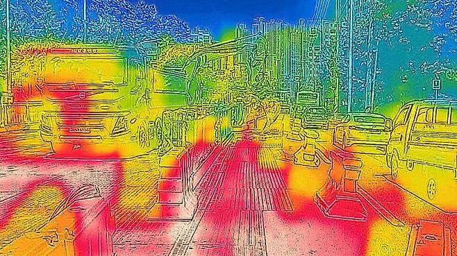 햇빛의 열기를 고스란히 흡수한 도로에는 일시적으로 아지랑이가 피어오르기도 했는데, 아지랑이는 열화상 카메라상에는 빈틈없는 진홍빛으로 나타났습니다.