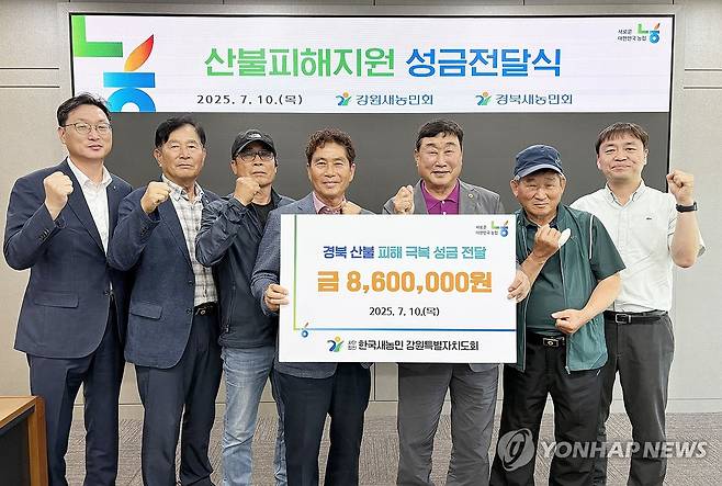 (춘천=연합뉴스) 10일 경북 안동시 농협 경북본부에서 열린 산불 피해 지원 성금 전달식에서 장용한 강원새농민회 회장과 농협 강원본부 관계자가 최영호 경북새농민회 회장에게 성금 860만원을 전달한 뒤 기념 촬영하고 있다. 2025.7.10 [농협 강원본부 제공. 재판매 및 DB 금지]