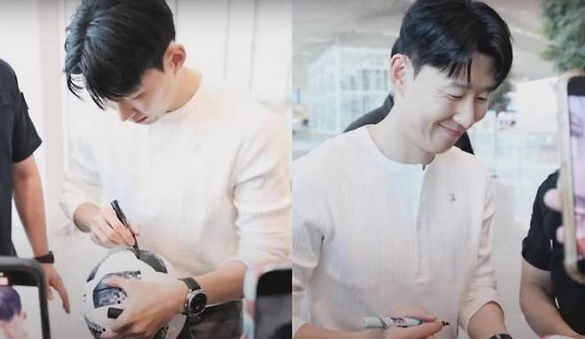 손흥민은 10일 오전 인천국제공항을 통해 영국 런던으로 출국했다. 이날 SNS에는 손흥민이 팬들에게 사인을 해주고 사진도 찍어주는 모습이 담긴 게시글이 여러 개 올라왔다.