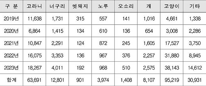 | ▲ 종별 로드킬 현황(2019~2023년) |