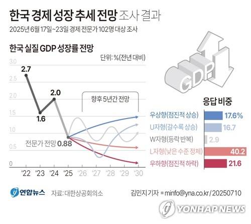 (서울=연합뉴스) 김민지 기자 = 10일 대한상공회의소에 따르면 대한상의가 2026~2030년 5년간 우리나라 성장 추세 전망에 대해 경제 전문가 102명을 대상으로 조사한 결과, 전문가 40.2%는 우리나라 경제성장률이 '낮은 수준에서 정체되는 L자형'을 보일 것이라고 예상했다.