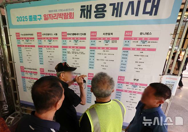 [서울=뉴시스] 조성우 기자 = 10일 오후 서울 종로구 종각역 태양의 정원에서 열린 2025 종로구 일자리 박람회에서 구직자가 채용 게시판을 살펴보고 있다. 2025.07.10. xconfind@newsis.com