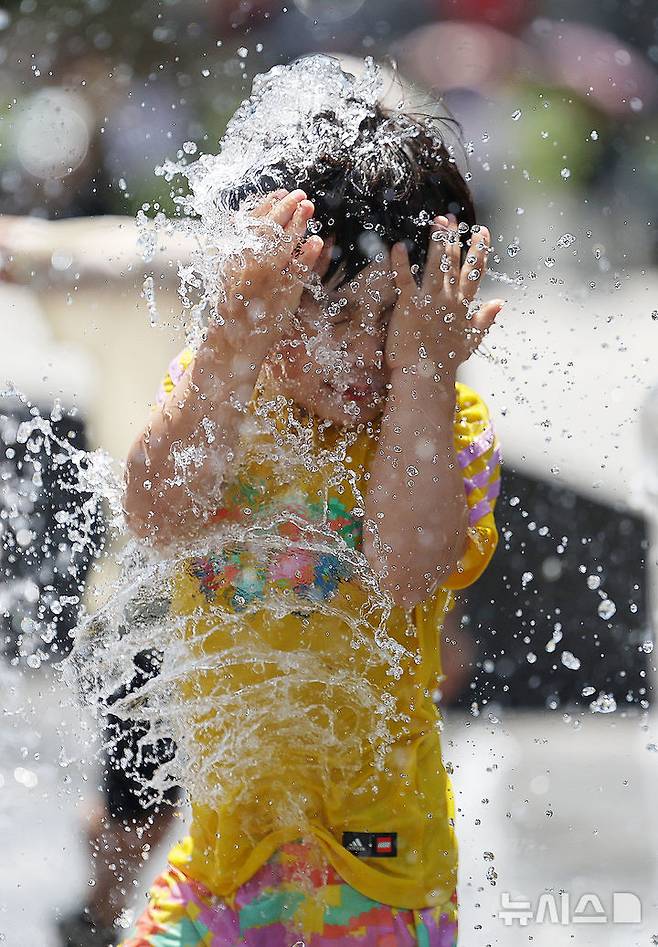[서울=뉴시스] 조성우 기자 = 폭염이 계속되는 10일 서울 종로구 광화문광장 분수에서 어린이가 물놀이를 하며 더위를 식히고 있다. 2025.07.10. xconfind@newsis.com